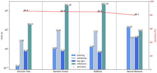 Both unencrypted and encrypted models are trained using unencrypted data, resulting in no significant difference in training time between them. For instance, the decision tree-based model (Table 5, Experiments 2 and 4) reached training times of 0.136 and 0.126 s, the Random Forest-based model (Expts. 6 and 8) reached training times of 0.835 and 0.990 s, the XGBoost-based model (Expts. 10 and 12) reached training times of 0.983 and 1.249 s, and the FCNN-based model (Expts. 14 and 16) reached training times of 11.860 and 13.033 s According to Concrete ML, model training includes a quantization task performed after or before the training itself, depending on the model type. In that way, the models generated by Concrete ML experience higher training times than scikit-learn models.