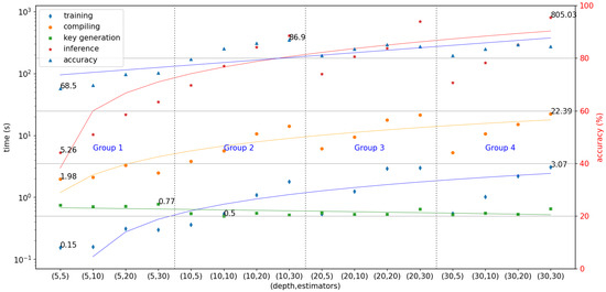 Additionally, we performed experiments to verify how the complexity of encrypted models affects the evaluation metrics. We chose the model based on RF because the difference in accuracy between the model using the default configuration and the one using the optimal configuration is greater, so any trend in values can be identified more easily. We also chose two parameters for hyperparameter tuning: depth and estimators. The results of these experiments are shown in Table 6, and the analysis of these results and the trends of each of the evaluation metrics are shown in Figure 5. Since it is difficult to determine if a configuration makes the model more or less complex than another when both parameters are increasing, we grouped the experiments into different sets (Groups 1 to 4). In these sets, only one of both parameters increases, so it is easy to determine that the current configuration makes the model more complex than the previous one.