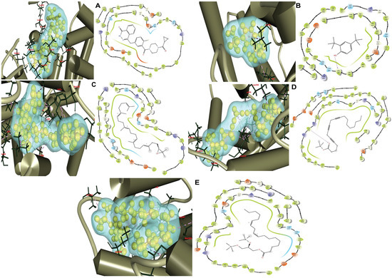 All the evaluated ligand molecules interacted with the estrogen receptor alpha (ERα) protein. The left-hand pictures show the three-dimensional structure of the protein–ligand complex, while the right-hand images show the two-dimensional structure. Here, (A) shows the 3D and 2D interactions between the ER protein and the control drug olaparib (CID-23725625), whereas comparative interactions with the ERα protein complex are demonstrated by (B) compound 2,4-di-tert-butylphenol (CID-7311); (C) compound 2,3-oxidosqualene (CID-5366020); (D) compound 5,8,11-eicosatriynoic acid, trimethylsilyl ester (CID-91696396); and (E) compound 1-monolinolein (CID-250006068).