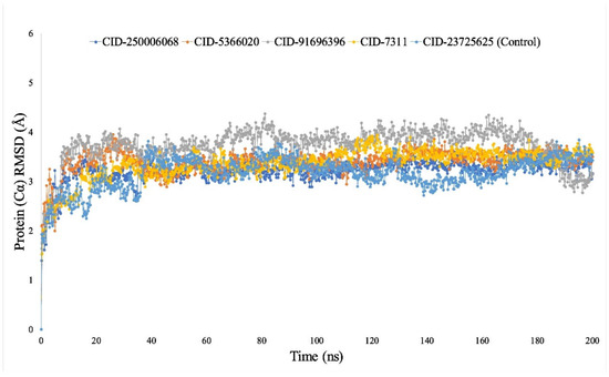 As a result, 100 ns MD simulations were performed to evaluate the helical modification for the target polypeptide in its interaction containing the five different ligand molecules represented by CID-250006068, CID-5366020, CID-91696396, CID-7311, and CID-23725625 (control). The normalized RMSD associated with the ligand molecule CID-250006068 ranged from 1.2 to 3.0. The typical RMSD of the ligand substance CID-5366020 ranged from 2.0 to 3.0. The normalized RMSD for the ligand molecule CID-91696396, which had fewer variations, was around 1.2 and 2.8. The normative RMSD for the ligand molecule CID-7311 ranged from 1.2 to 3.2. The average RMSD for the ligand complex CID-23725625 (control) ranged from 1.2 to 3.1. The previous protein–ligand complex arrangement demonstrated translational integrity, as the material’s identity fluctuated somewhat as well as being below the permitted threshold (Figure 2).