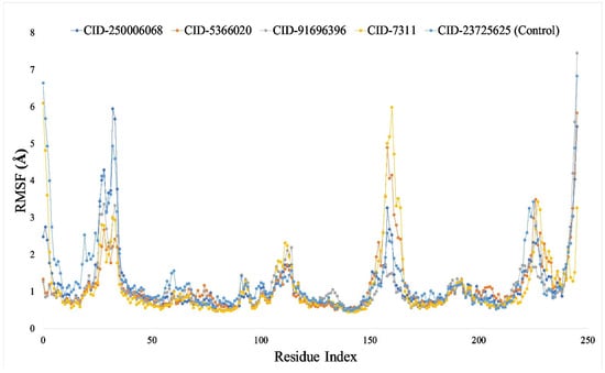 The RMSF readings corresponding to the 3ERT polypeptide modeling corresponding to the five ligand molecules identified in the C atoms of the complex structure. The chosen components CID-250006068, CID-5366020, CID-91696396, and CID-7311, followed by CID-23725625 (control), appear as blue, orange, gray, yellow, and sky-blue in combination with the corresponding protein, sequentially.