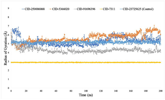 A simulation with a duration of 100 ns to calculate the radius of gyration (Rg). Blue, orange, gray, yellow, and sky-blue represent the selected compounds CID-250006068, CID-5366020, CID-91696396, CID-7311, and CID-23725625 (control) in association with the proteins, respectively.