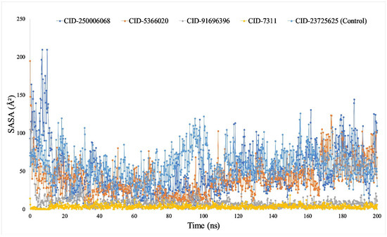 The 100 ns simulated interacting diagram applied to determine the solvent-accessible surface area (SASA) underlying the protein–ligand interacting complexes. The chosen substances CID-250006068, CID-5366020, CID-91696396, and CID-7311, together with CID-23725625 (control), appear as blue, orange, gray, yellow, and sky-blue in combination with the corresponding protein in them, correspondingly.