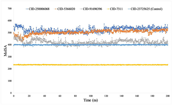 The molecule surface area (MolSA) of the protein–ligand interacting complexes calculated using the 100 ns simulated interaction schematic. The chosen combinations CID-250006068, CID-5366020, CID-91696396, and CID-7311, followed by CID-23725625 (control), are shown as blue, orange, gray, yellow, and sky-blue in combination with the protein content, correspondingly.