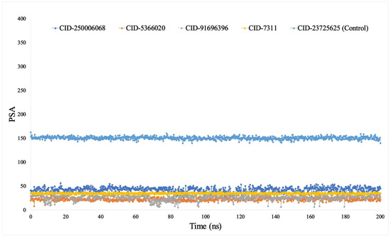 The polar surface area (PSA) of the simulated protein–ligand interactions molecules calculated using 100 ns simulated interaction graphs. The chosen chemicals CID-250006068, CID-5366020, CID-91696396, and CID-7311, together with CID-23725625 (control), are displayed as blue, orange, gray, yellow, and sky-blue in combination with the target protein, respectively.