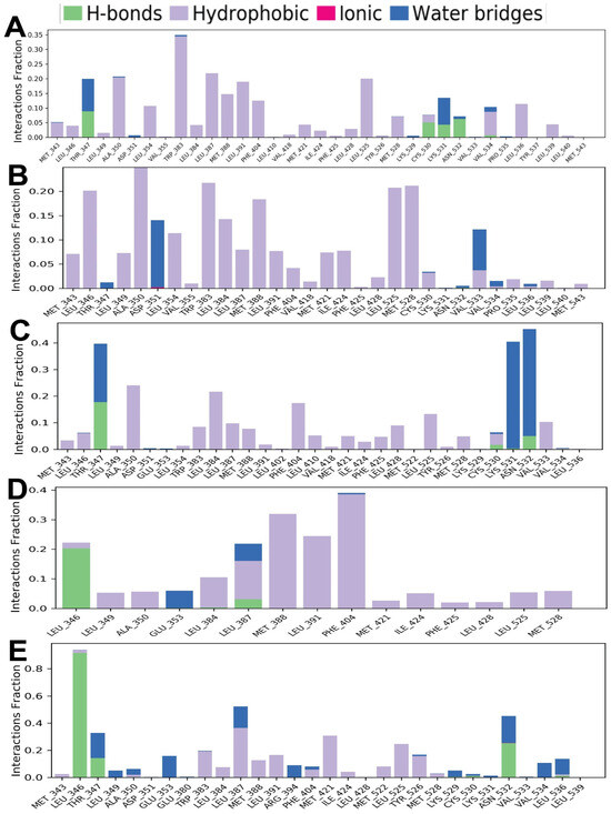 The relationships amongst ligands and protein molecules that were found throughout the 100 ns simulations depicted in layered bar diagrams. This section provides examples of the interactions between the chosen ligand molecules. Wherein CID-250006068, CID-5366020, CID-91696396, and CID-7311, CID-23725625 (control) are the five antagonists that were chosen and are associated with the corresponding protein. In this instance, CID-250006068, CID-5366020, CID-91696396, and CID-7311, CID-23725625 (control) are designated as (A–E), respectively.