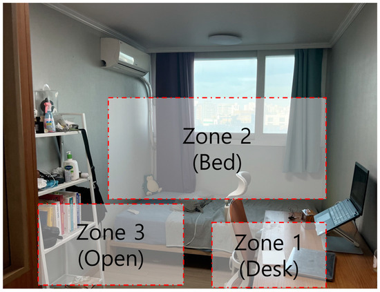 To determine occupancy status and location, the space was divided as shown in Figure 1. Zone 1, where the desk is located, was designated for general study and office work. Zone 2, housing the bed, was primarily used for sleep. Zone 3 encompassed areas for other movement and standing activities.