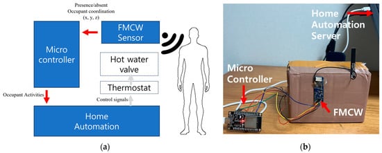 Configuration of sensor station: (a) Schematic diagram of data flow; (b) install condition of FCMW sensor, data acquisition device, and home automation platform.