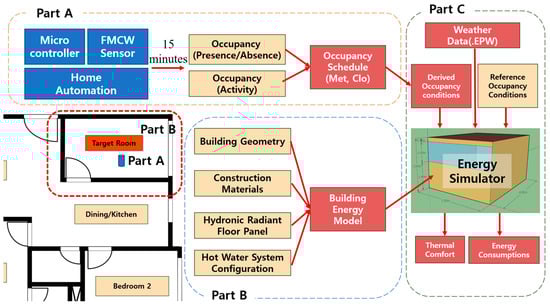 Figure 5 illustrates the overall structure of this study. An FMCW-based human presence sensor was installed in a single room of an actual residential building, and occupancy was monitored for five consecutive weekdays and two weekends. By utilizing the geometric distance provided upon occupancy detection, not only the occupancy status but also the relative position of the occupant within the occupied space was determined to infer the activities performed during occupancy. The measured data were analyzed in a time-series manner to determine occupancy and non-occupancy durations. Using the analyzed data, the occupant’s schedule, Met value during occupancy, and Clo value were inferred to generate occupancy environment data for the residents (Part A). A building thermal response model was developed, reflecting the thermal properties of the building’s walls, floor, and ceiling based on their shapes and structures. A building energy analysis model was constructed by combining this thermal response model with a system model identical to the heating system used in the actual building (Part B). The constructed building energy analysis model was used to analyze the heating energy consumption of the model during the winter season, utilizing real weather data from the region where the building is located. By comparing the indoor thermal comfort and energy consumption when operating the hydronic heating system using the derived actual occupancy and activity schedule with the case of operating the heating system with a typical residential building operating schedule and set conditions, an operating strategy to reduce the heating energy required while maintaining indoor thermal comfort was developed (Part C).