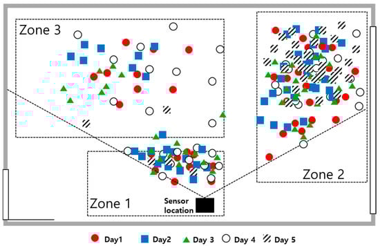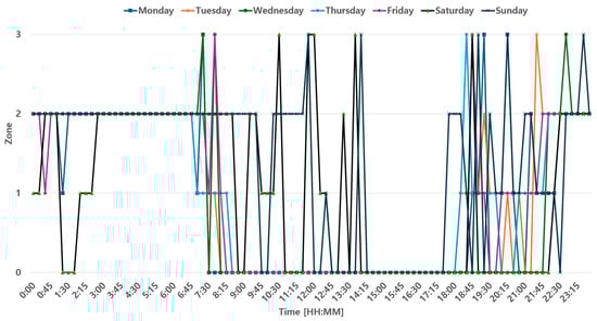 Occupancy sensors were installed in the measurement space to analyze occupancy patterns in each zone over five weekdays in the winter season. The FMCW sensor generates data using a coordinate system when occupancy occurs, calculating the distance and angle of the occupant relative to the sensor’s center point at a rate of one data point per second. The measured data are converted back into coordinate values (x-y distance) using a microprocessor and can be displayed on a planar representation of the space through location mapping. Missed and lost signals are represented as null values to prevent confusion with unoccupied conditions (Zone 0). For cases where the position changes at each measurement, the most frequent position for 15 min is determined as the occupancy location at that measurement time. Figure 6 illustrates the spatial distribution of occupants within the target space during five weekdays (4–8 December 2023). By employing the plane of the space and predefined zones, the measured data, including the sensor’s measurable angle (60 degrees) and distance, were converted into location coordinates and visualized. Zone 1, characterized by the presence of a desk, is primarily designated for sedentary activities such as work and study. Zone 2, where the bed is situated, is predominantly utilized for sleep. Zone 3, comprising bookshelves and closets, represents activities beyond those in zones 1 and 2, primarily standing. Over the five-day period, the occupancy pattern was predominantly centered in Zone 2, reflecting the prevalence of sleep-related activities. Zones 1 and 3, associated with study and work activities and standing activities, respectively, exhibited lower occupancy frequencies.
