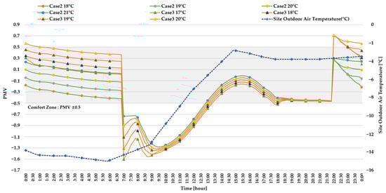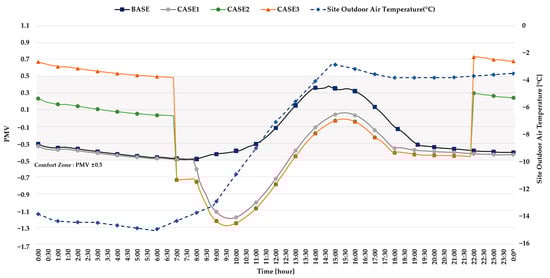 Figure 8 presents the calculated thermal comfort levels for each case at hourly intervals on a day with a minimum outdoor temperature of −15 °C. In the base case, with a constant metabolic rate (Met) and clothing insulation (Clo), the PMV values ranged from −0.7 to 0.3, indicating thermal comfort. During the afternoon, the PMV value reached a maximum of 0.3 due to the operation of the heating system and solar heat gain, resulting in an increase in indoor temperature.