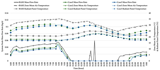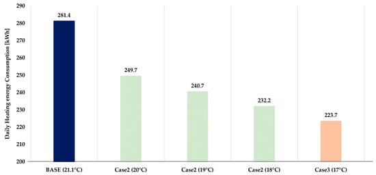 Adjusting the indoor set temperature can reduce the thermal load on the heating system and the operation of its components. As illustrated in Figure 10, adjusting the indoor set temperature during sleep can decrease the required circulation flow rate of the hydronic radiant panel heating system. The base case, operating at a constant set temperature throughout the day, required a maximum instantaneous flow rate of 0.06 kg/s, and a range of 0.027 kg/s to 0.053 kg/s during both sleep and occupied periods. In contrast, resetting the set temperature based on occupied and unoccupied periods eliminated the need for daytime heating and significantly reduced the required circulation flow rate during sleep and occupied periods. For Case 2, with a target setpoint air temperature of 18 °C during sleep hours, the flow rate ranged from 0.021 to 0.045 kg/s. For Case 3, with the setpoint override temperature of 18 °C, the flow rate ranged from 0.018 to 0.043 kg/s. When comparing the daily heating energy consumption on a day with the lowest outdoor temperature of the year, as shown in Figure 11, Case 2 achieved up to an 18% reduction and Case 3 up to a 21% reduction in energy consumption compared to the base case.
