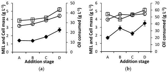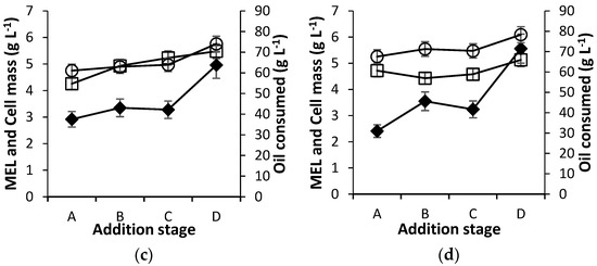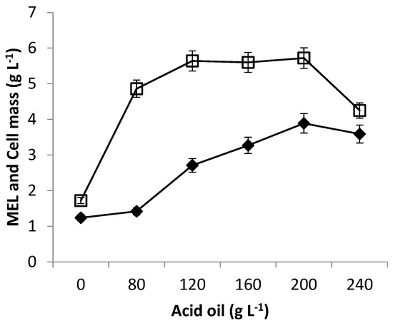 Similarly, oil consumption, as well as cell growth, was improved and the MEL titer was found to be increased up to 4.96 g L−1 and 5.56 g L−1 with 160 g L−1 and 200 g L−1 periodic feedings of acid oil, respectively. Under different feeding rates, surprisingly, MEL formation was increased by 2.04 fold with fed-batch cultivation compared to batch cultivation. The controlled feeding strategy with a 200 g L−1 substrate concentration improved the MEL production up to 0.07 g L−1 titer after 7 days of fermentation (Figure 3d).