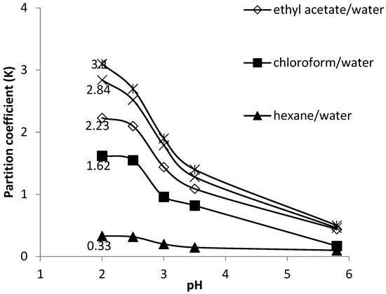 Effects of pH on the partition coefficients of different solvents with water for MEL extraction.