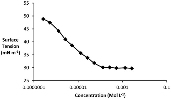 Figure 6 depicts the surface tension reduction profile with an increase in the molar concentration of MEL. The MEL produced from acid oil was shown to have a critical micelle concentration (CMC) of 2.8 × 10−6 M with 29.3 mN m−1 surface tension at the CMC (γCMC). In the literature, the CMC of the MEL produced from Pseudozyma antarctica with soybean oil as substrate had been estimated to be 2.7 × 10−6 M [11], which was comparable to the obtained results. Similarly, Konishi et al. had reported a high value of 6.0 ×10−6 M for the CMC and 25.1 mN m−1 for the minimum surface tension for MEL–C produced from P. hubeiensis (KM-59) in a fed-batch culture grown on soybean oil as the carbon source [17].