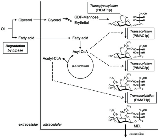 - Saika, A.; Koike, H.; Yamamoto, S.; Sugahara, T.; Kawahara, A.; Sogabe, A.; Morita, T. Improvement of oil degradation and MEL production in a yeast strain, Pseudozyma tsukubaensis, by translation elongation factor 1 promoter-driven expression of a lipase. J. Oleo Sci. 2022, 71, 1421–1426. [Google Scholar] [CrossRef] [PubMed]