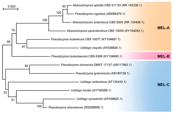 Molecular phylogenetic tree of some MEL-producing microorganisms. [Adapted from open-access article, Ref. [36], available at: Biomolecules 2024, 14(5), 557; https://doi.org/10.3390/biom14050557].