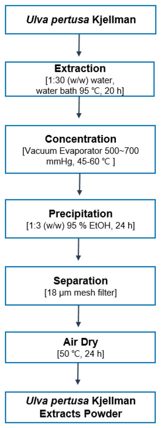 U. pertusa was harvested from Sinyang-ri (33°26′4.70″ N 126°55′24.16″ E, Jeju, Republic of Korea) [22] between February and April and dried using an air dryer (Jeio Tech, Daejeon, Republic of Korea) at 40 °C for 48 h. U. pertusa extract was prepared as per the method presented in Figure 1 [23].