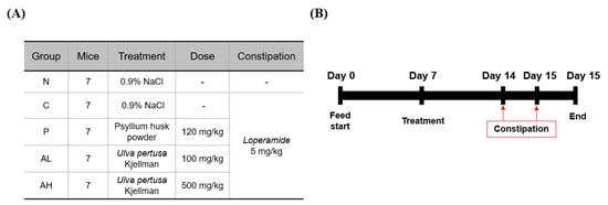 A schematic depicting the experimental design. (A) A cohort of mice was randomly divided into the following five groups: constipation induced via 5 mg·kg−1·day−1 loperamide treatment (C, control), psyllium husk powder treatment at 120 mg·kg−1·day−1 (P, positive control), U. pertusa extract administered at 100 and 500 mg·kg−1·day−1 (AL and AH, respectively), and the administration of an equivalent volume of saline solution (N, vehicle). (B) After 7 days of acclimatization, daily oral administration was conducted over 8 days, followed by a 2-day loperamide-induced constipation intervention on day 14 and mice sacrifice on day 15.