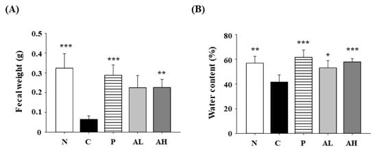 The effects of U. pertusa administration on stool excretion in mice. (A) Fecal samples collected after a 5 h constipation-induction treatment were measured. (B) Subsequently, the samples were oven-dried and weighed to determine the dry weight. Water content was determined using the relevant formula. Experiments were conducted in septuplicate. Results are presented as the mean ± standard deviation. * p < 0.05, ** p < 0.01, *** p < 0.001, compared with the control group. Abbreviations: N, vehicle; C, control; P, positive control; AL, 100 mg·kg−1·day−1 U. pertusa extract; AH, 500 mg·kg−1·day−1 U. pertusa extract.