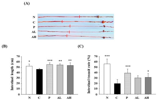 Additionally, the intestinal transit rate was significantly reduced in the loperamide treatment group (C, 19.8 ± 7.4%) compared with that in the vehicle group (N, 56.2 ± 9.0%; p < 0.001) on day 15 (Figure 4C). However, U. pertusa treatment increased the intestinal transit rate (AL, 30.3 ± 4.0%; AH, 31.3 ± 6.9%; p < 0.05).