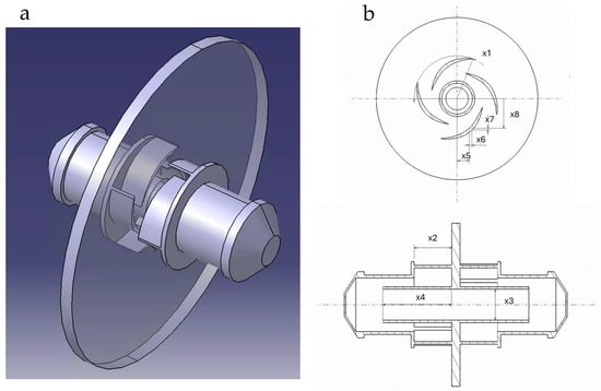 Figure 3b indicates each parametric dimension with an ID number (x1, …, x8), which is then reported in Table 1 with the definition of the corresponding range of variation (minimum and maximum value of each dimension). More specifically, the parameters considered are the blade’s height and angle of development, the internal radius of the hub and its length, and the coordinates of the median point of the external and internal profiles of the blades.