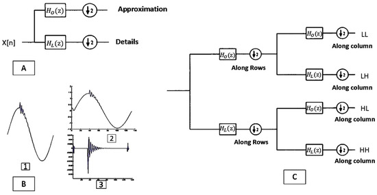 (A) Implementation of discrete wavelet transform using low-frequency and high-frequency filters at one level [34]. (B) O ne-dimensional signal (1) and its decomposition into approximation (2) and detail (3) using one-dimensional wavelet transform. (C) Implementation of two-dimensional wavelet transform at one level using filter banks [34].