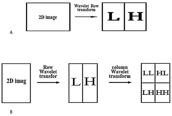 (A) The first step in extracting the two-dimensional wavelet transform at two levels [34]. (B) Decomposition using two-dimensional wavelet transform in two steps [34].