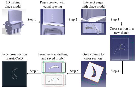 To generate toolpaths, converting the three-dimensional design into two-dimensional layers and subsequent definition of the toolpath within them are essential steps. The transformation of the three-dimensional design into two-dimensional layers was carried out using Catia software V5R18, as depicted in Figure 10, which outlines the procedural steps for creating a toolpath for fabricating a curved-blade component based on its three-dimensional model. These steps encompass the following:
