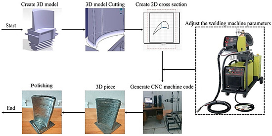 The stages of the production of components through additive manufacturing utilizing a CNC machine are elucidated in Figure 11. The workflow commenced with a three-dimensional model and culminated in the creation of a three-dimensional body. As previously elucidated, the three-dimensional model transformed two-dimensional layers using Catia software. Subsequently, the deposition path was devised for each layer in AutoCAD software. The deposition path and pertinent welding parameters were converted into codes for integration into the CNC system. The desired shape was ultimately manufactured, with machining and post-processing conducted as necessary.