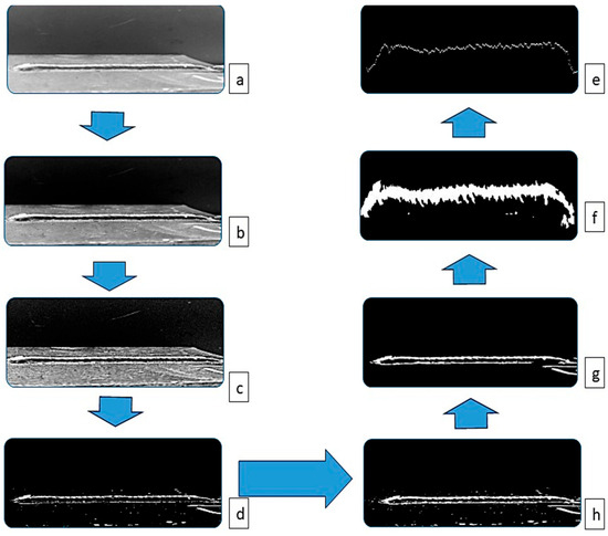 Welding bead image processing steps: (a) Base image. (b) Appling filters. (c) Increase image contrast. (d) Edge sharpening. (e) Image binarization. (f) Using imdilate function and stretch image in 45° direction. (g) Filling image holes. (h) Detect upper line.