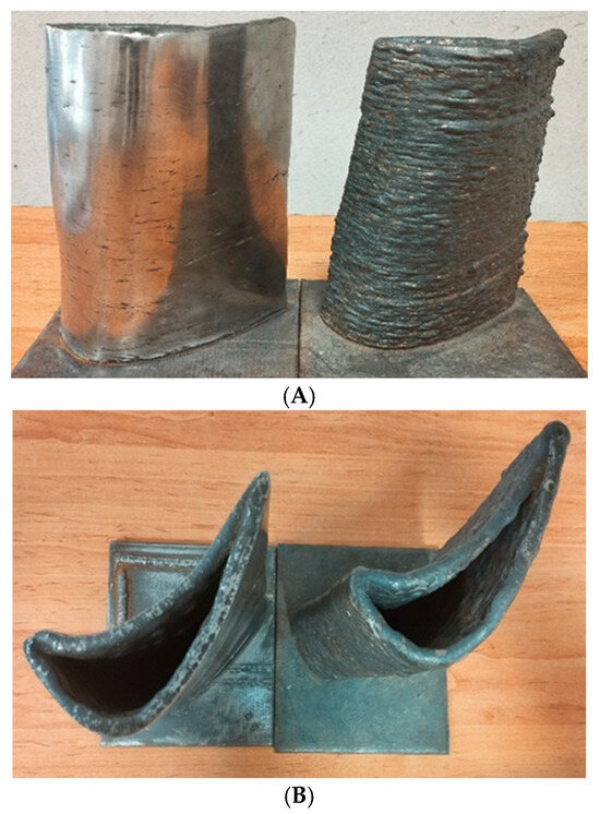 Two turbine blades manufactured: (A) front view; (B) top view.