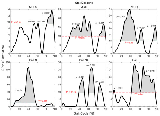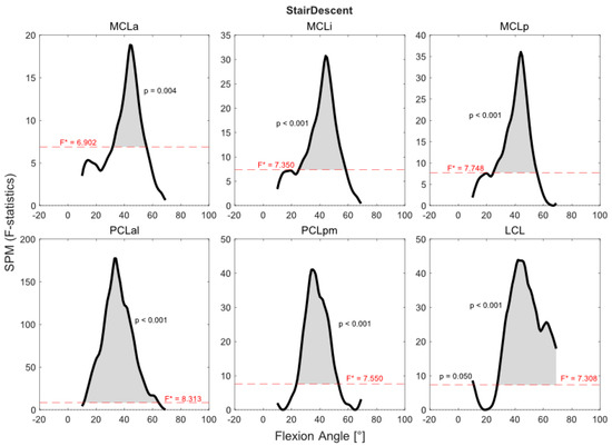 - Sole, G.; Pataky, T.; Tengman, E.; Hager, C. Analysis of three-dimensional knee kinematics during stair descent two decades post-ACL rupture—Data revisited using statistical parametric mapping. J. Electromyogr. Kinesiol. 2017, 32, 44–50. [Google Scholar] [CrossRef]