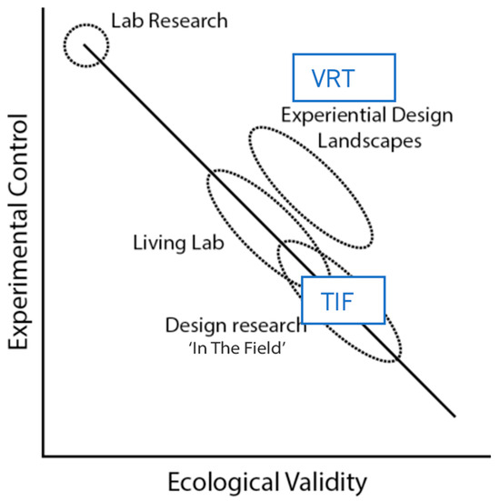 In this study, we compare VR to non-VR prototyping in different ways, firstly focusing on experimental control and external validity in order to receive valuable insights into the user experience. The testing of contextual realism as a metric of external validity was viewed through the context framework of Calder [37]. In their research, external validity is defined as whether an observed causal relationship should be generalized to and across different measures, persons, settings and times. For this purpose, the field test and context in VR were introduced. In his paper, Kjeldskov [38] defines realism and control as two major trade-offs when testing in situ or in vitro. Related to this, Peeters [39] uses a graph for mapping research methods in respect to these two major trade-offs (see Figure 1). The blue rectangles indicate the hypothesised mapping of the research techniques discussed in this study: testing in the field (TIF) and virtual reality testing (VRT). This study envisions VRT to cause more experimental control compared to TIF. Also, VRT should allow similar levels of ecological validity compared to TIF.