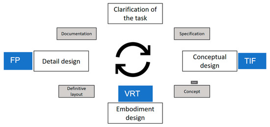 From Nielsen’s [49] mapping methods (Table 1), we learn that design-related user research methods serve a purpose as formative tools and the methods for launch and assessment serve a purpose as summative tools. Under formative methods, we understand an ongoing, iterative type of testing [50]. This reflects itself in concept testing, interviews and field studies. Meanwhile, summative evaluation is used to measure and compare results [50]. This reflects itself in comparative usability benchmarking and unmoderated UX testing. In this research is it important to analyse usability in both a formative and more summative way. Low-fidelity prototype testing was used in the field as a formative evaluation method (testing in the field referred to as TIF), where VR (virtual reality testing referred to as VRT) and the testing of the final product (referred to as FP) were more summative evaluation methods. A proposed mapping can be seen in Table 1 and Figure 2. Qualitative methods were used to analyse the place in the NPD wherein the field testing and VR testing fit. To structure this design process, we applied the product innovation cycle of Pahl and Beitz [51] which can be seen in Figure 2. We hypothesised that virtual reality testing fits most in the embodiment phase in the product innovation cycle of Pahl and Beitz compared to testing in the field earlier in the conceptual design phase (final product at the end of detail design). As stated by Cross [52], design methods are still based on the approach of Pahl and Beitz today. Cross also highlights that design generation should keep in mind both the problem and proposed solution at the same time.