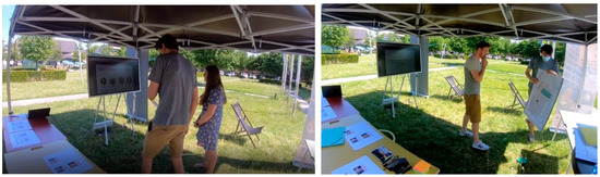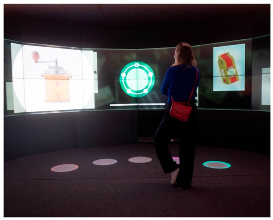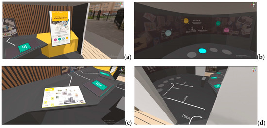 Like during testing in the field, three interfaces were tested in VR as well (see Figure 5). These tests were carried out in November 2021. The first of these interfaces was an introductory touch screen. Afterwards, the visitor could follow arrows on the ground to the next interface. This second interface was controlled using step-activated tiles. The next interface was adapted, as the interaction of walking along confused the participants in the first user test (TIF). After following the arrows on the ground to the last interface, the participants arrived at a touch screen table. For the virtual reality testing, an Oculus Quest 2 headset was used with a Unity-based VR application. This application was built using a framework developed for performing experiments in VR. This framework aims at creating a highly immersive product-testing experience. It objectively measures interactions, cognitive–affective states and user behaviour. By applying a think aloud protocol, more qualitative input was gathered from the participants. The designed experience was kept short (5–10 min) which reduced the chance of visual fatigue. This study also applied an onboarding condition to familiarize the participants with a virtual environment to counter negative effects such as disorientation and a lack of control during the experience.