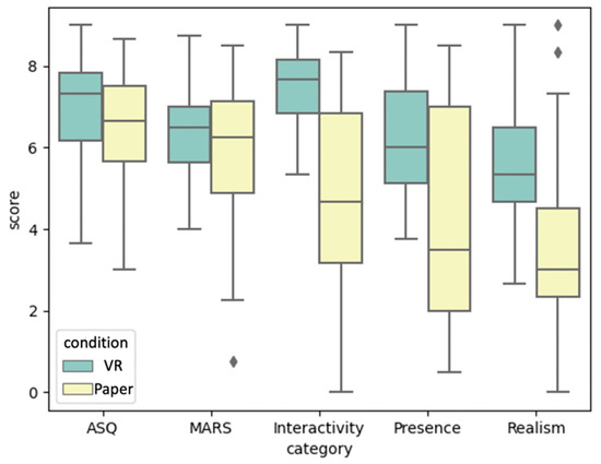 During the quantitative comparative test, the students delivered some interesting insights. When looking at the questionnaire data, we see that the participants (n = 27) rated the VR environment better in terms of interactivity, presence and realism (see Figure 7). However, more use-oriented items such as functionality (excerpt from the MARS questionnaire) and overall task difficulty do not seem to differ all that much. The normality tests (Appendix A, Table A1) indicate that the data regarding presence, task difficulty and functionality are not normally distributed, while the results for realism and interactivity are normally distributed. After running a paired samples t-test or a Wilcoxon signed rank on each element, it turned out that there were significant effects found for interactivity, presence and realism.