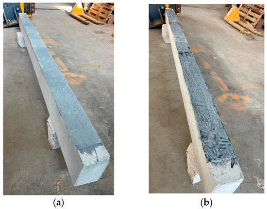 The beams were strengthened by the externally bonding FRP technique using two different materials, namely GFRP and CFRP. Prior to the strengthening process, the beam surface intended for contact with the strengthening material (i.e., bottom surface of the beam) was thoroughly roughened and cleaned to improve adhesion. Pre-cut woven glass or carbon fibers, having dimensions of 150 mm by 2800 mm, were bonded to the beam with an adhesive. Two layers of glass or carbon fibers were applied in all strengthening procedures. During the bonding process, each layer was meticulously flattened and pressed with a roller to remove air bubbles and ensure full saturation. A thin layer of adhesive was applied between each fiber layer. After completing the strengthening process, the beam was maintained at room temperature for a week to cure the strengthening material and ensure a good bond between the beam and the strengthening material. The FRP thickness in the beams strengthened with GFRP was 2.6 mm, with a fiber volume fraction of 11%, while the FRP thickness in the beams strengthened with CFRP was 2.1 mm, with a fiber volume fraction of 19%. Examples of GFRP and CFRP applications on beams are provided in Figure 2.