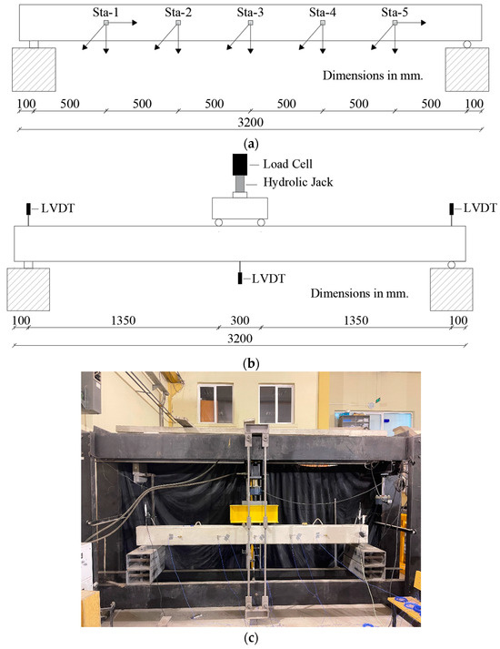 A total of 2 tri-axial and 6 uni-axial piezoelectric type accelerometers, resulting in 12 measurement points, were used to capture the dynamic responses of the beams. The amplitude range, frequency bandwidth, and sensitivity of the accelerometers were ±5 g, 0.25–3000 Hz, and 1000 mV/g, respectively. The data acquisition system employed was an NI-PXI system, which included a PXI-4472 A/D card having simultaneous sampling capability and anti-aliasing filters. The layout of the accelerometers, with their positive polarities, is presented in Figure 3a. At this stage, the mode shapes of a preliminary numerical model were analyzed, with the primary motivation of capturing as many dynamic responses as possible. In Figure 3a, Sta-1 and Sta-5 (where ‘Sta’ denotes accelerometer stations) each contains one tri-axial accelerometer, whereas Sta-2, Sta-3, and Sta-4 each has two uni-axial accelerometers placed in the vertical and horizontal (i.e., perpendicular to the beam axis) directions. Additionally, 3 Linear Variable Displacement Transducers (LVDTs), with a capacity of 100 mm, were used to measure the static responses during the quasi-static tests. Two of the transducers (i.e., one at each support) were positioned to monitor vertical movements at the supports, while the third transducer was employed to measure and cross-check the midspan displacement of the beam, which was imposed by a load cell with a pressure capacity of 300 kN. A four-point bending test setup was adopted in order to create a region in the center of the beam free from shear forces, allowing the experimental variables to be studied under the influence of bending moments alone. Since for an a/d (i.e., shear span/effective depth) ratio greater than approximately 6, the beam will fail in flexure before the formation of inclined shear cracks, and given that the main objective was to investigate the flexural response, the a/d ratio was set at 6.3, with a and d being 1350 mm and 215 mm, respectively. A schematic presentation of the static test system and the general view of the test setup are shown in Figure 3b,c.