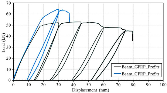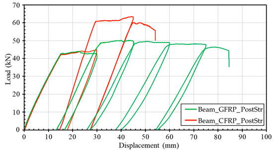 Load–displacement curves of Beam_GFRP_PostStr and Beam_CFRP_PostStr.