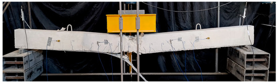 The average 28th day cylinder compressive strength of the concrete was ~20 MPa. The concrete mixture consisted of 275 kg/m3 cement, 190 kg/m3 water, 450 kg/m3 11–22 mm aggregate, 450 kg/m3 4–11 mm aggregate, 900 kg/m3 0–4 mm aggregate, and 2.8 kg/m3 plasticizer. The reinforcing bars had a yield strength of 420 MPa, a tensile strength of 500 MPa, an elastic modulus of 200 GPa, and a Poisson’s ratio of 0.3. The mechanical properties [45,46] and physical properties of the glass fiber and carbon fiber materials used for strengthening the beams are presented in Table 2. The adhesive was prepared by combining thixotropic epoxy resin and hardener in a 4:1 ratio. It exhibited a tensile strength, modulus of elasticity, and elongation at break of 30 MPa, 4.5 GPa, and 0.9%, respectively [47].