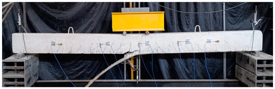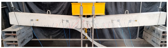 During the static loading test of Beam_CFRP_PreStr, the first flexural crack appeared in the tensile zone of the concrete when the applied load approached 24.51 kN (i.e., at 7.21 mm displacement), corresponding to approximately 37% of the ultimate load of 66.24 kN. As the load increased, numerous flexural cracks formed. These cracks were not concentrated in the midspan region but were distributed along the length of the beam. At a load of 58.12 kN (i.e., 21.34 mm displacement), the longitudinal steel reinforcement yielded. After the load reached a maximum of 66.24 kN, the cracks in the concrete cover became more pronounced and started to propagate toward the left. At a displacement of 37.65 mm (i.e., at 60.56 kN load), failure occurred due to the debonding of the CFRP strengthening material along with the concrete cover, resulting in a sudden drop in load and the termination of the test (see Figure 4). Although slight crushing was observed in the concrete compression zone, debonding happened before the beam reached its full flexural capacity. Compared to Beam_GFRP_PreStr, which was strengthened with GFRP, Beam_CFRP_PreStr failed at a lower displacement level while bearing a higher load value (see Figure 4). The failure mode of Beam_CFRP_PreStr is illustrated in Figure 6.