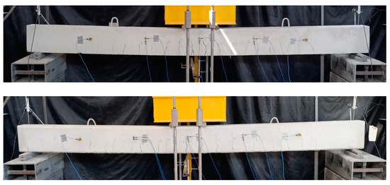 As mentioned earlier, Beam_GFRP_PostStr and Beam_CFRP_PostStr, which were initially bare beams, were pre-damaged up to 30 mm displacement (i.e., D1 damage level) and strengthened with GFRP and CFRP, respectively. The load–displacement curves of Beam_GFRP_PostStr and Beam_CFRP_PostStr are presented in Figure 7. The pre-damaging procedure serves as a reference for the pre-strengthened beams, namely Beam_GFRP_PreStr and Beam_CFRP_PreStr. The first crack in the midspan region occurred at 18.83 kN (i.e., at 5.98 mm displacement) and 19.23 kN (i.e., at 6.18 mm displacement) for Beam_GFRP_PostStr and Beam_CFRP_PostStr, respectively. As the load increased, additional flexural cracks formed. The longitudinal steel reinforcement yielded at 42.61 kN (i.e., at 15.11 mm displacement) for Beam_GFRP_PostStr and 41.86 kN (i.e., at 15.23 mm displacement) for Beam_CFRP_PostStr. Representations of Beam_GFRP_PostStr and Beam_CFRP_PostStr at the D1 damage level are given in Figure 8.
