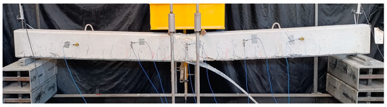 During the static test conducted after the strengthening of Beam_GFRP_PostStr with GFRP, the first new crack formed at a load value of 43.05 kN (i.e., at 28.71 mm displacement). As the load increased, additional flexural cracks developed. After the strengthening procedure, the maximum load value increased by 14.15% compared to the pre-strengthening state. At a midspan displacement of 62.52 mm, cracks in the concrete cover became more pronounced and extended horizontally to the right. A decrease in load values was observed during the fourth and fifth loading cycles. When the displacement reached 84.32 mm (i.e., at 44.13 kN load), the GFRP layer debonded from the concrete interface, leading to failure. Complete crushing occurred in the concrete of the compression zone, and Beam_GFRP_PostStr exhibited ductile flexural behavior similar to that of Beam_GFRP_PreStr, as shown in the load–displacement curve (see Figure 7). The failure mode of Beam_GFRP_PostStr is presented in Figure 9.