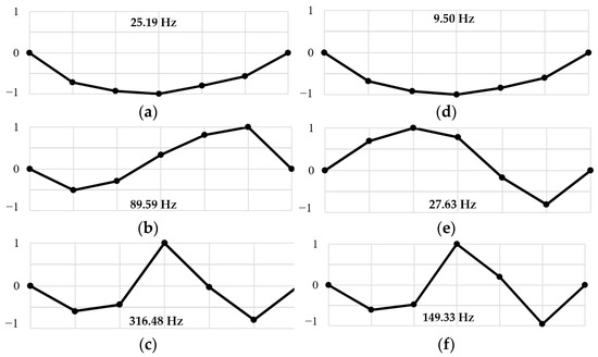 Mode shapes of the bare beams in the undamaged state: (a) first, (b) second, and (c) third mode in the vertical direction; (d) first, (e) second, and (f) third mode in the horizontal direction.