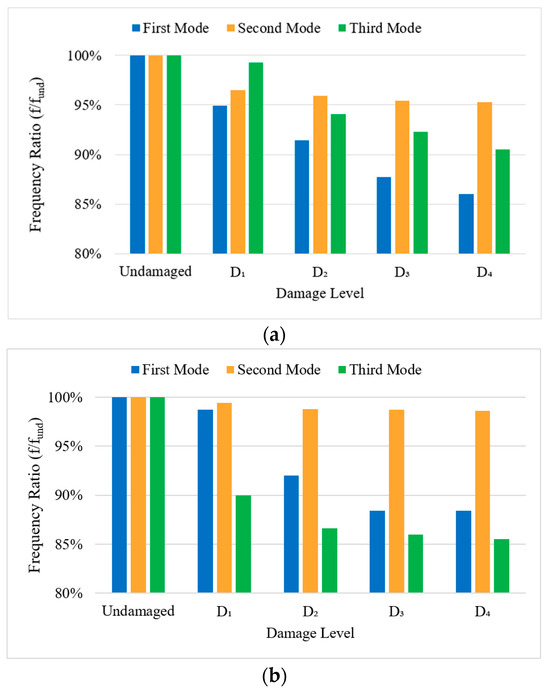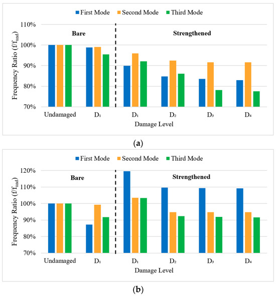 Variation in modal frequency ratios at different damage levels for Beam_GFRP_PostStr in (a) the vertical direction and (b) the horizontal direction.