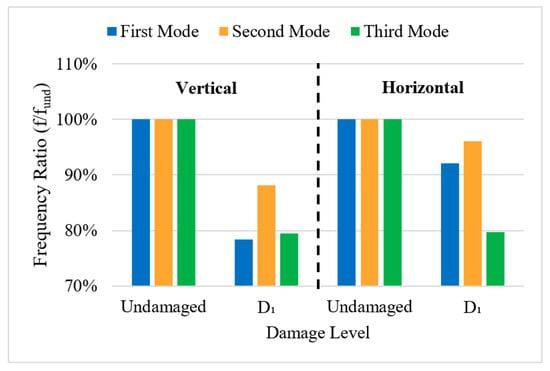 Modal frequency ratios were calculated by dividing the modal frequency estimates at different damage levels by those in the undamaged state, enabling the proportional change in modal frequencies to be monitored. The focus was on the relative changes in frequency ratios rather than the absolute frequency values, highlighting the influence of damage and strengthening on the dynamic behavior of the beams. Table 7 provides the modal frequency ratios for Beam_GFRP_PreStr at various damage levels, encompassing both the vertical and horizontal directions. These ratios offer insight into the effect of progressive damage on the modal frequencies of the beam. Figure 12 illustrates the variation in these ratios for the vertical and horizontal directions.