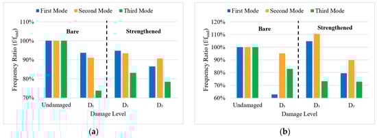 Variation in modal frequency ratios at different damage levels for Beam_CFRP_PostStr in (a) the vertical direction and (b) the horizontal direction.