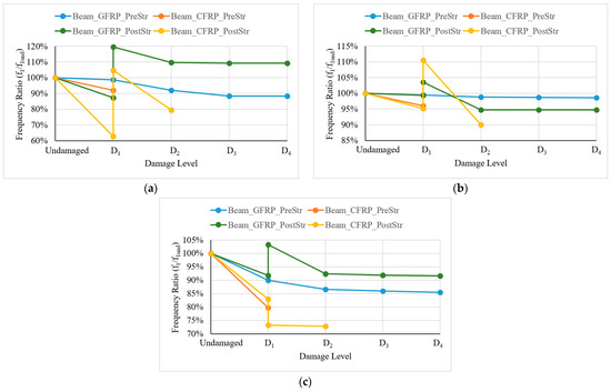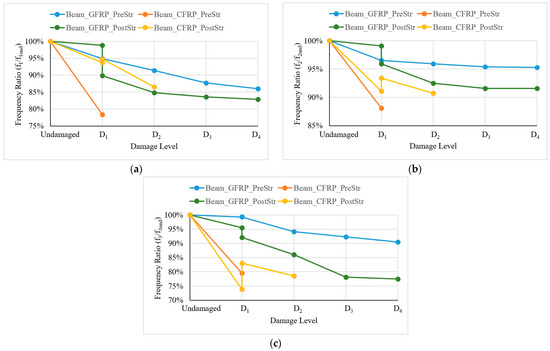 Modal frequency ratios in the vertical direction for the (a) first, (b) second, and (c) third modes of all beams.
