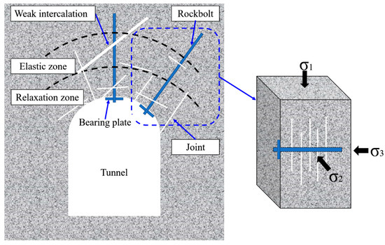 Surrounding rocks of underground caverns generally contain structural planes, including fractures and faults, which decrease their stability, making it necessary to support the surrounding rock with bolts (Figure 1). It can be seen that anchored surrounding rocks are stressed in three directions, with only one free face in the cavern direction. When surrounding rocks are deformed, it drives the deformation of bolts, which generates tensile force. The tensile force on such bolts suppresses the deformation of the surrounding rocks, improving the stability of the surrounding rock stability.